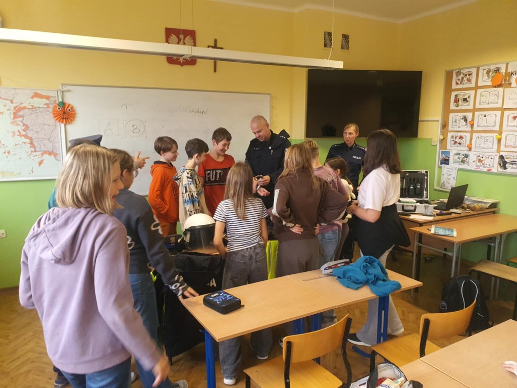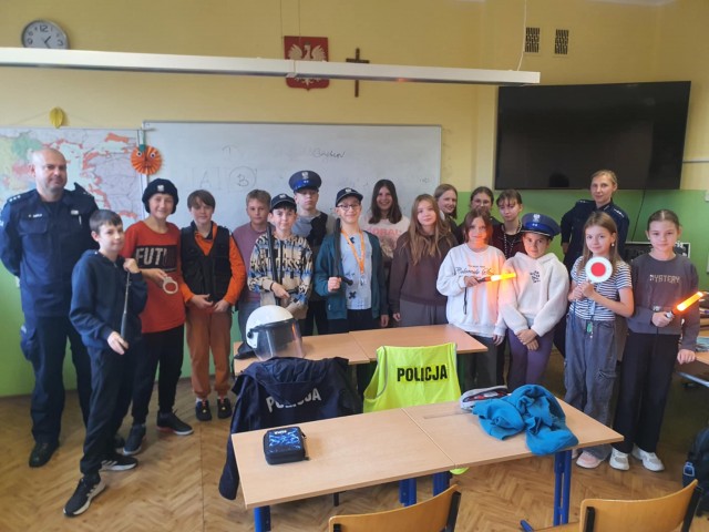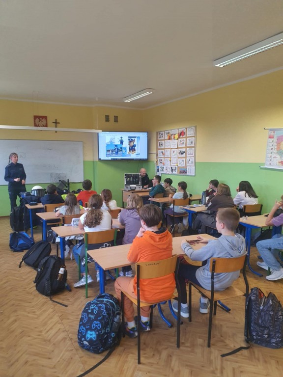 W piątek, 24 października uczniowie klasy V wzięli udział w ciekawym i bardzo pouczającym spotkaniu z funkcjonariuszami Policji. Goście opowiedzieli o zasadach bezpiecznego poruszania się po drogach oraz przypomnieli, jak dbać o bezpieczeństwo w Internecie. Podczas spotkania uczniowie dowiedzieli się, jak prawidłowo przechodzić przez jezdnię, dlaczego tak ważne jest noszenie odblasków i jak reagować w sytuacjach zagrożenia. Policjanci zwrócili również uwagę na odpowiedzialne korzystanie z Internetu: mówili o cyberprzemocy, ochronie danych osobowych oraz o tym, jak bezpiecznie korzystać z mediów społecznościowych.
