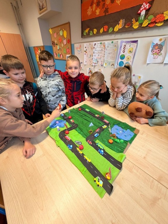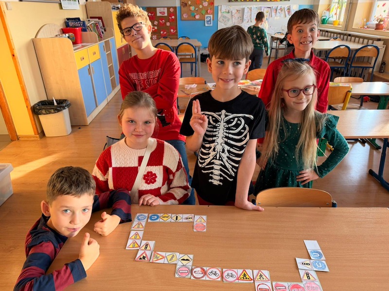 Podczas zajęć w świetlicy szkolnej uczniowie tworzyli własne gry edukacyjne typu domino, miasteczko ruchu drogowego oraz znaki drogowe. Rozmawialiśmy także o tym, jak zachować się bezpiecznie na drodze i dlaczego warto nosić odblaski.