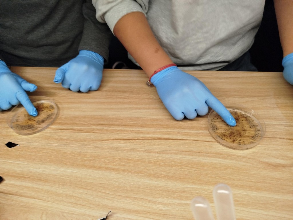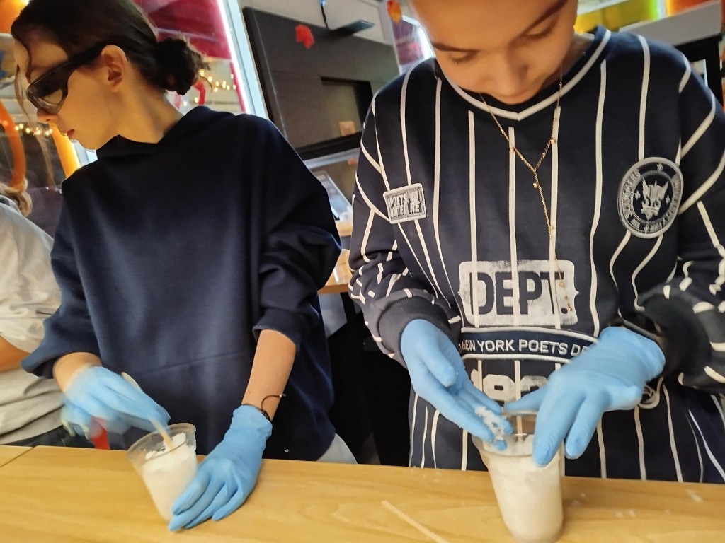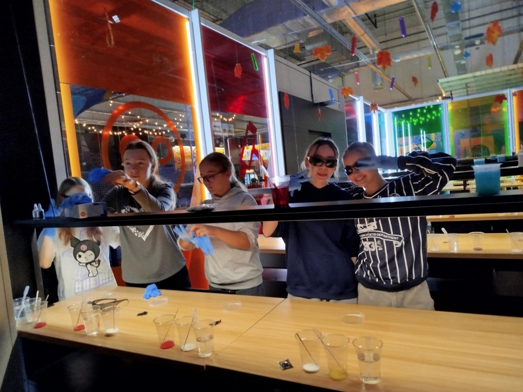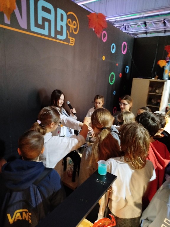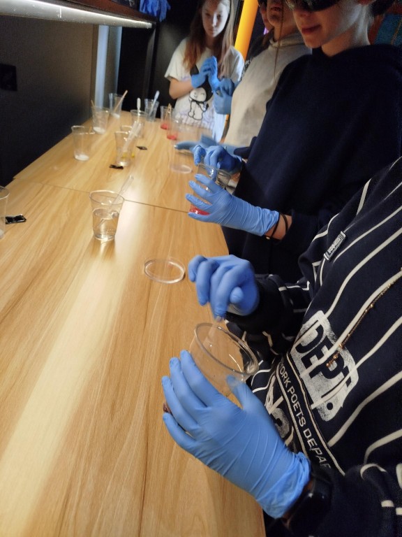 Naszą przygodę rozpoczęliśmy od udziału w warsztatach FunLab, podczas których uczniowie samodzielnie wykonywali efektowne doświadczenia chemiczne i fizyczne. Sprawdzali między innymi, jak działa napięcie powierzchniowe wody — obserwowali, jak ziarenka pieprzu unoszą się na powierzchni, a następnie „uciekają” po dotknięciu wody palcem z mydłem. Wykonali także sztuczny śnieg z superabsorbującego polimeru oraz poznali „magiczny eliksir” z wykorzystaniem suchego lodu, który zamieniał wodę w gęstą, efektowną mgłę. Uczniowie mogli poczuć się jak prawdziwi naukowcy — eksperymentowali, obserwowali i wyciągali wnioski.