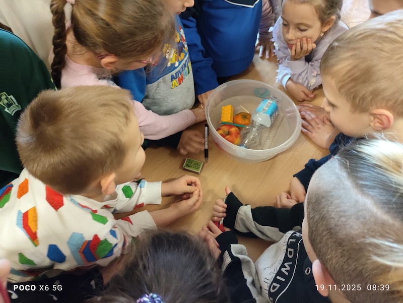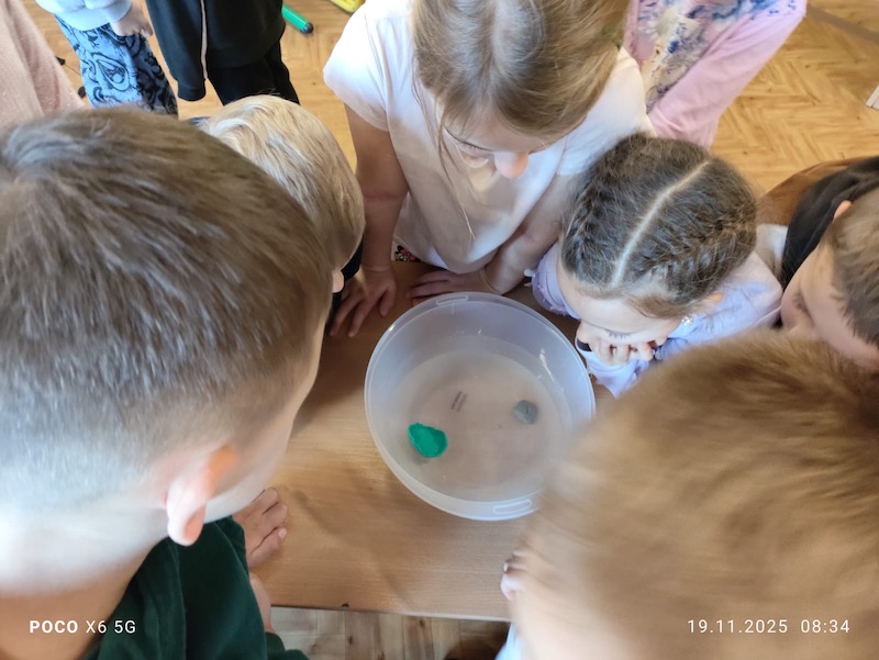 Uczniowie badali, co pływa, a co tonie, wrzucając do wody różne przedmioty i obserwując