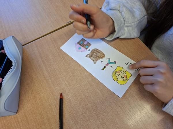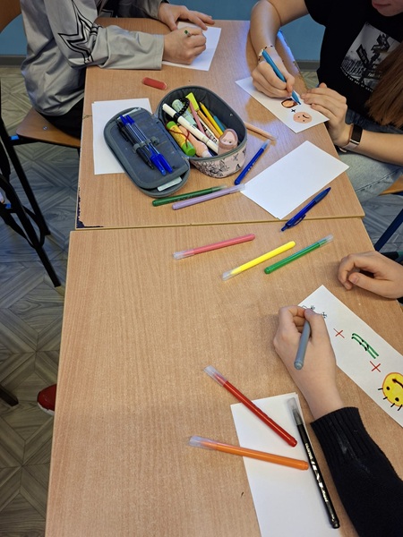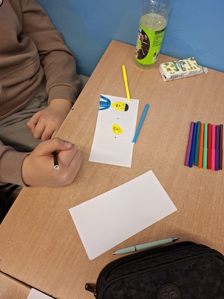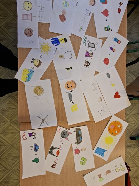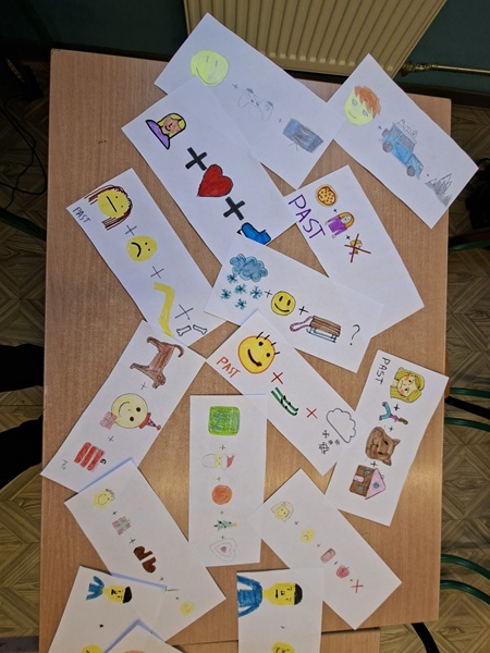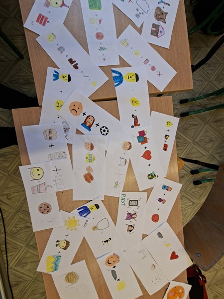 Każdy z uczniów miał przygotować 3 zdania na podsatwie wyłącznie emotek. Musiał je narysować i odpowiednio dopasować tak, aby późńiej następna osoba mogła je właściwie zinterpretować.