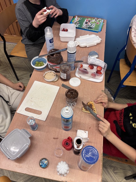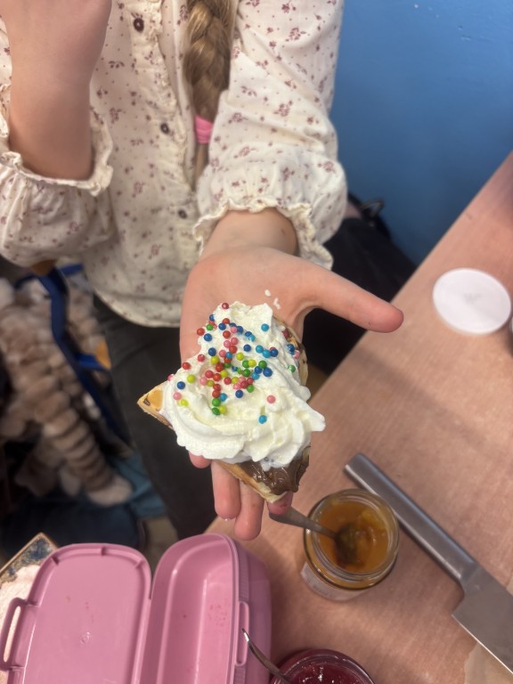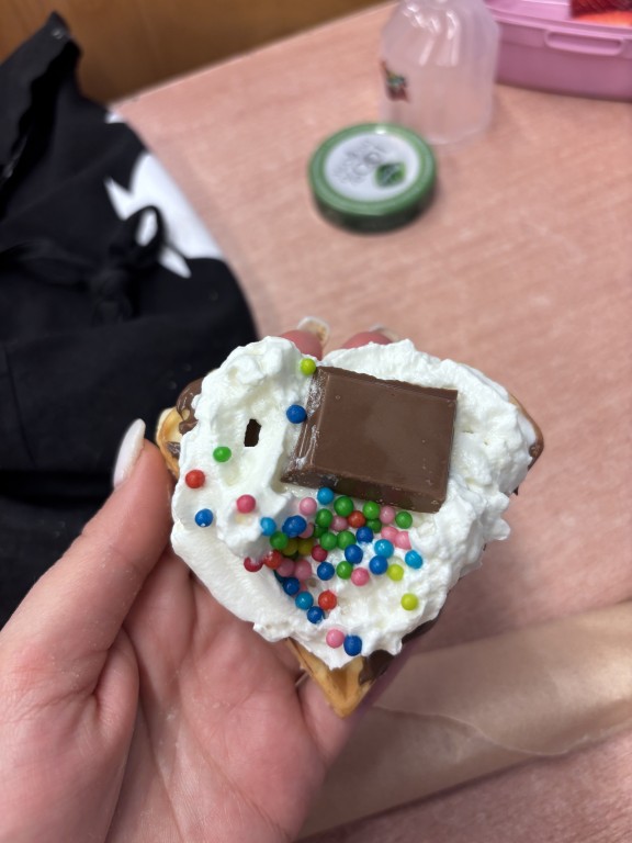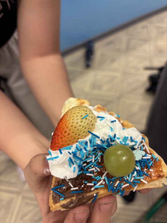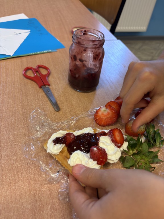 Każdy przyniósł swoje ulubione dodatki - były świeże owoce, bita śmietana, dżemy, czekolada i wiele innych pyszności. Dzięki temu każdy mógł stworzyć gofra dokładnie takiego, jak lubi najbardziej!