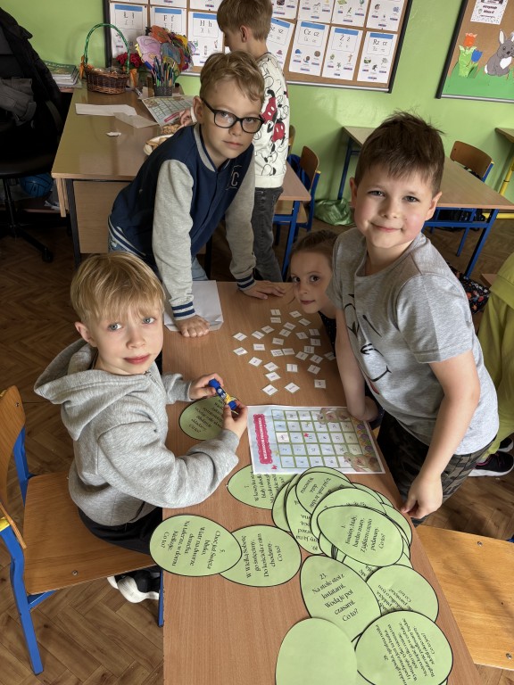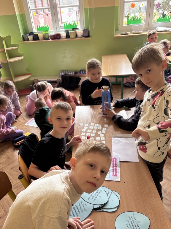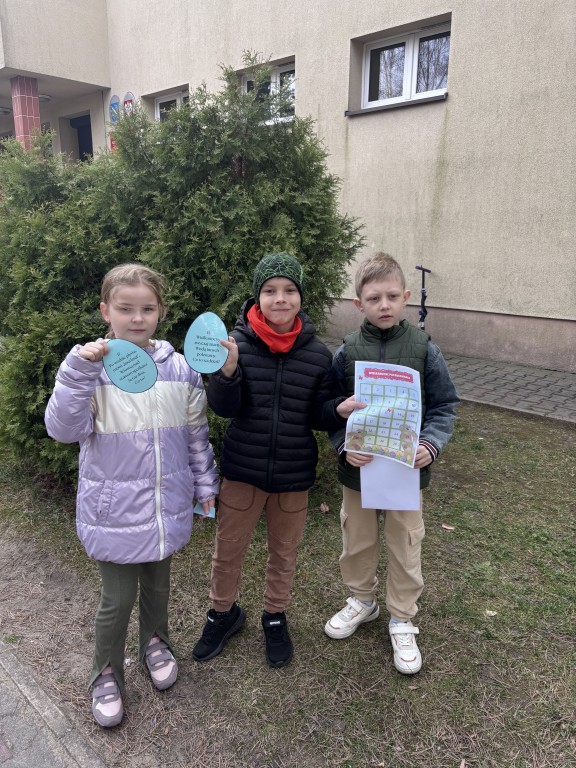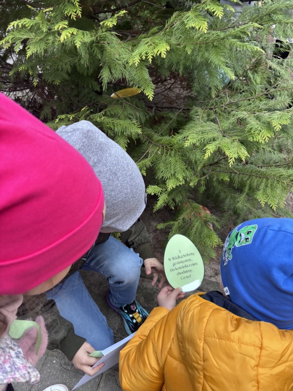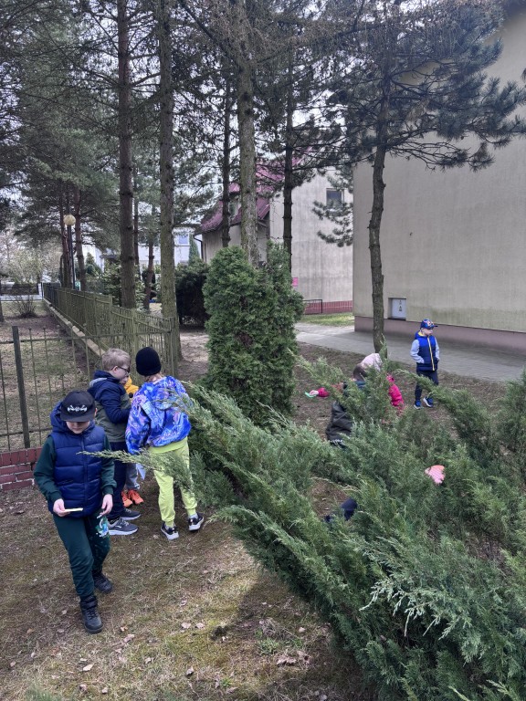 Z okazji zbliżających się Świąt Wielkanocnych uczniowie klas I i II wzięli udział w wyjątkowej grze terenowej. Dzieci z ogromnym zaangażowaniem poszukiwały ukrytych jajek, rozwiązując wielkanocne i wiosenne zagadki