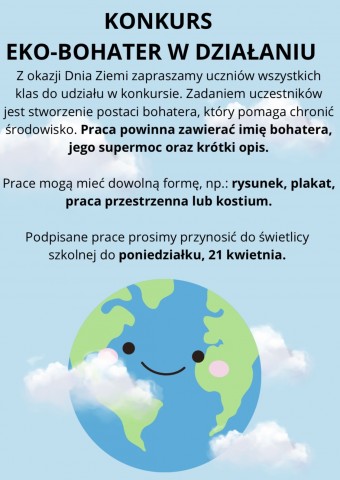 Z okazji zbliżającego się Dnia Ziemi zapraszamy uczniów wszystkich klas do udziału w konkursie „Eko-bohater w działaniu”.