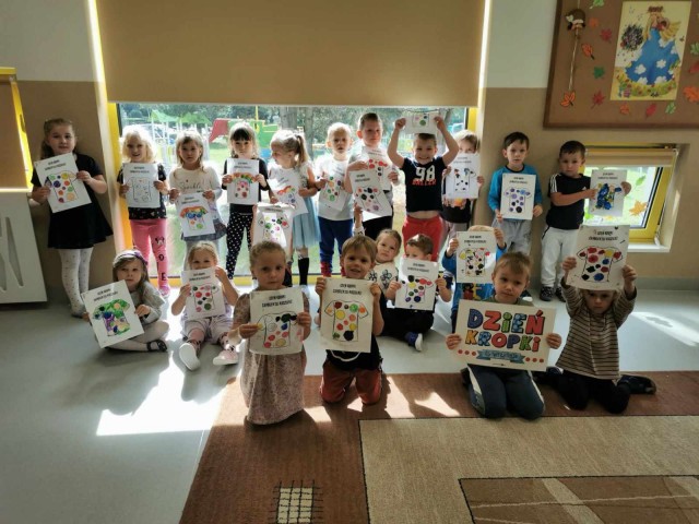 16 września obchodziliśmy Dzień Kropki. Dzieci wspólnie wykonały drzewo z kropek oraz każdy indywidualnie zaprojektował swoją koszulkę w kropki z farb.