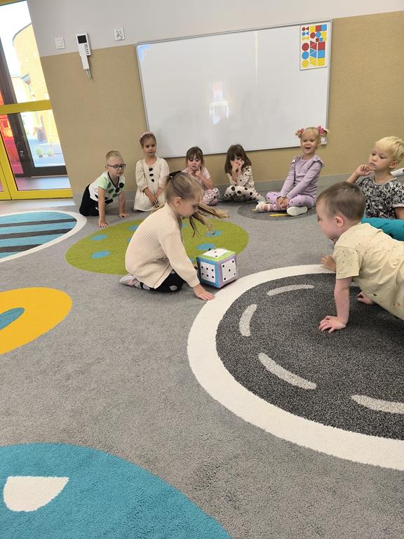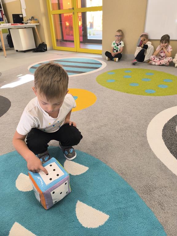Nasze świętowanie rozpoczęliśmy od zabawy z kostką – dzieci z wielkim zaangażowaniem liczyły kropki, ćwicząc przy tym spostrzegawczość i umiejętności matematyczne.