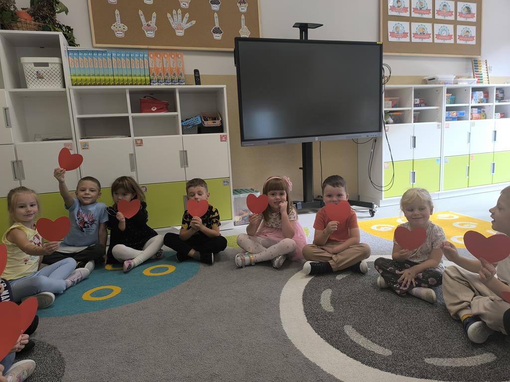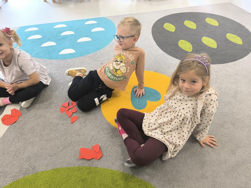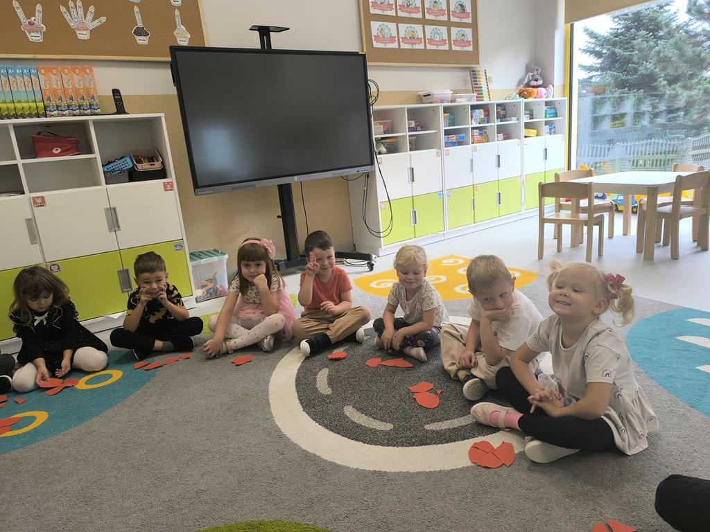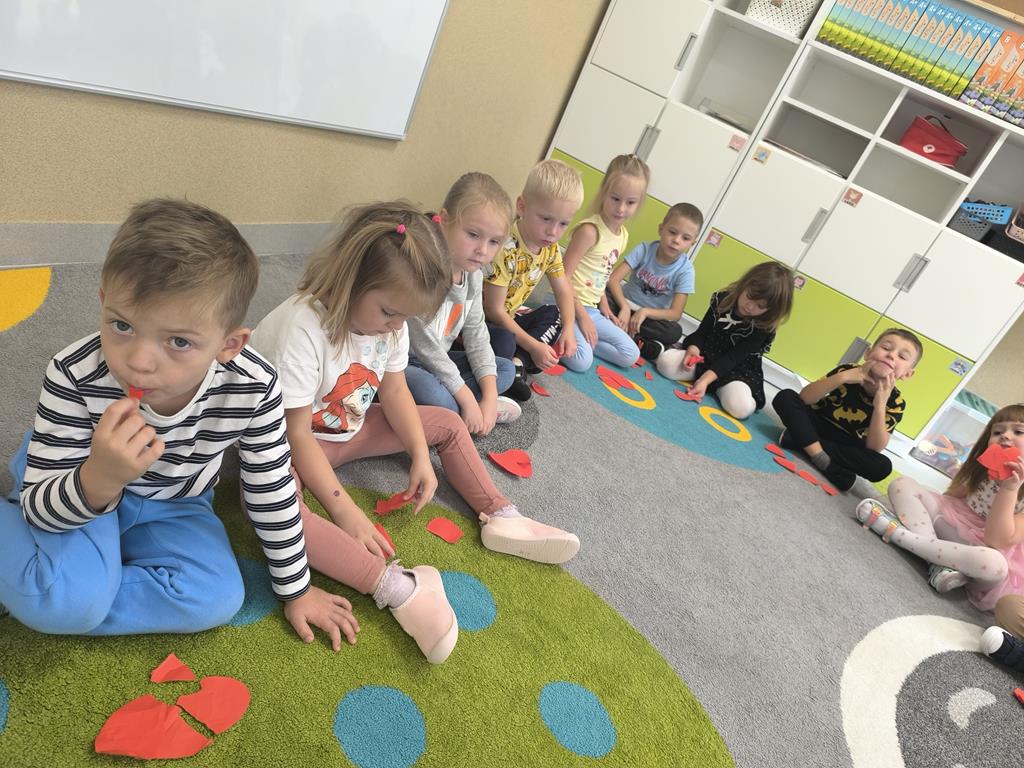 Po wysłuchaniu tej historii dzieci zostały zaproszone do wspólnej zabawy, której celem było pokazanie, jak ważne jest przepraszanie i wyrażanie emocji. Każde dziecko otrzymało serduszko, które najpierw rozdarło na kawałki, a potem wspólnie posklejało, symbolizując, że naprawa relacji wymaga wysiłku i współpracy, ale jest możliwa.