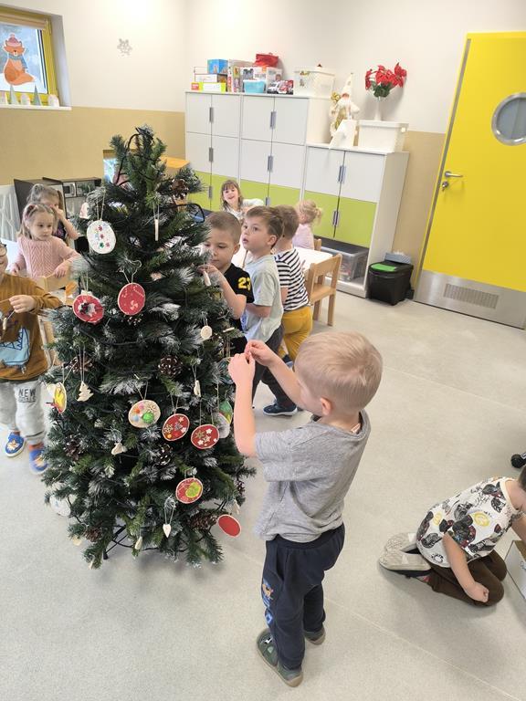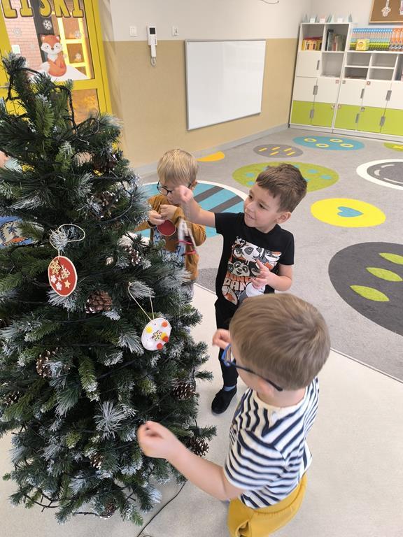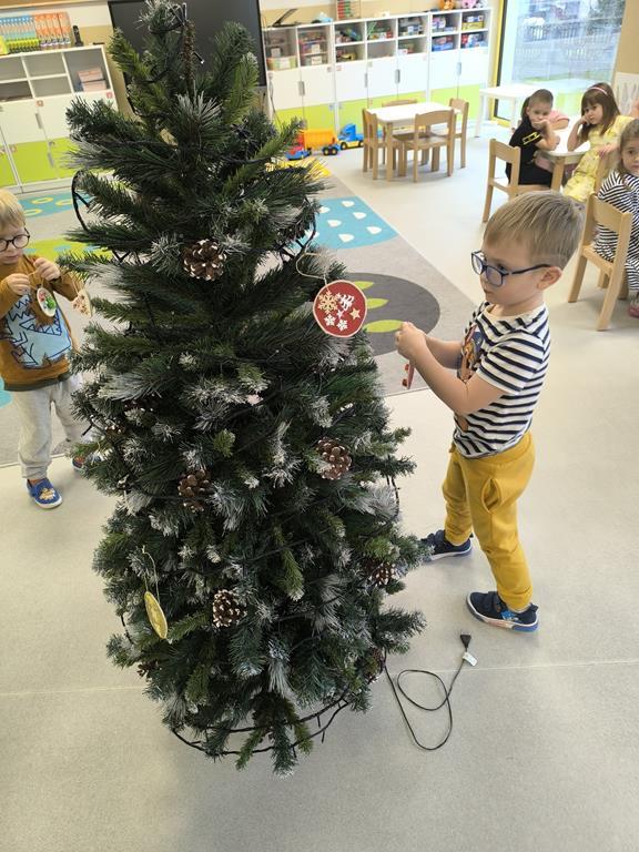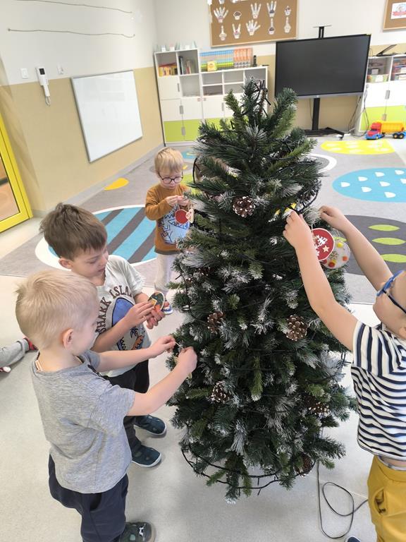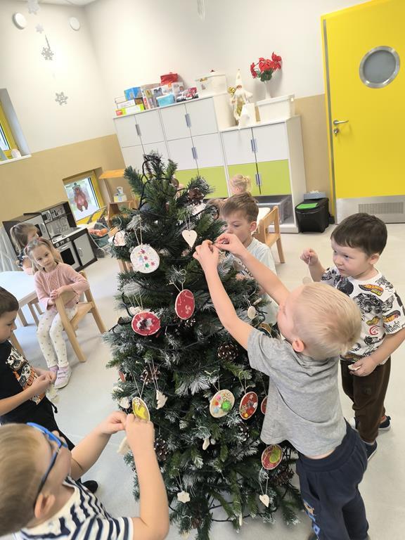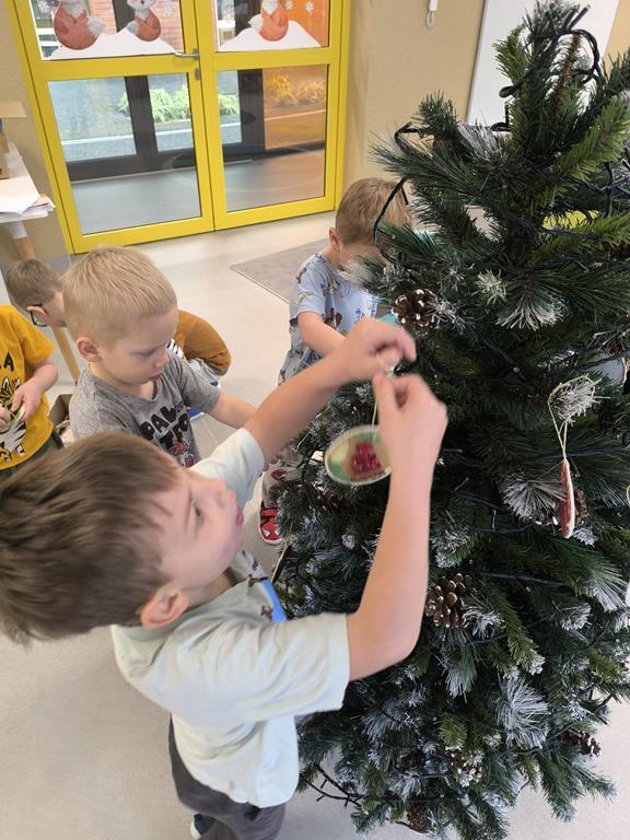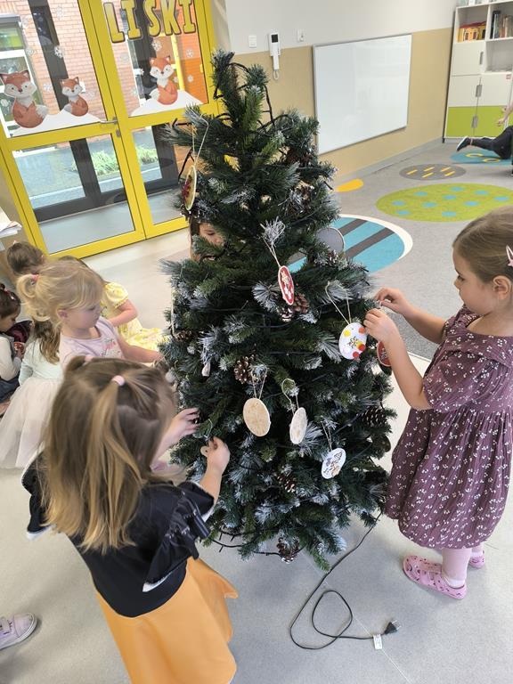 W piątek „Liski” wspólnie ubierały przedszkolną choinkę. Maluchy z dużym zaangażowaniem wybierały ozdoby i zawieszały je na gałązkach, tworząc barwną i wyjątkową świąteczną dekorację. Podczas pracy towarzyszyły im świąteczne piosenki oraz radosny, przedświąteczny nastrój. Dzięki wspólnemu wysiłkowi choinka stała się piękną ozdobą naszej sali, a dzieci mogły poczuć magię nadchodzących świąt.