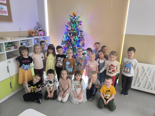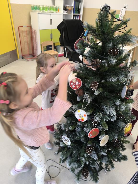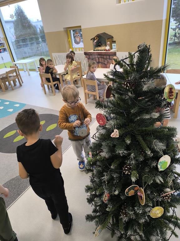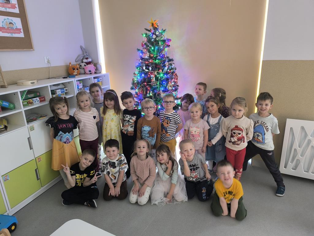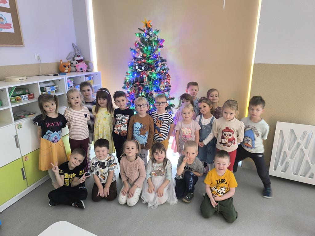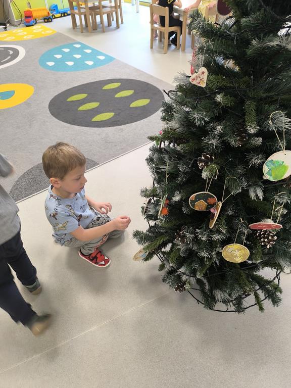 W piątek „Liski” wspólnie ubierały przedszkolną choinkę. Maluchy z dużym zaangażowaniem wybierały ozdoby i zawieszały je na gałązkach, tworząc barwną i wyjątkową świąteczną dekorację. Podczas pracy towarzyszyły im świąteczne piosenki oraz radosny, przedświąteczny nastrój. Dzięki wspólnemu wysiłkowi choinka stała się piękną ozdobą naszej sali, a dzieci mogły poczuć magię nadchodzących świąt.