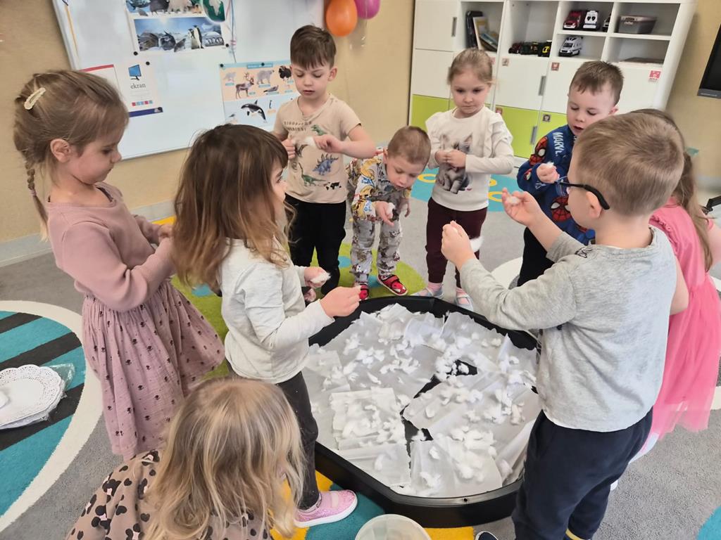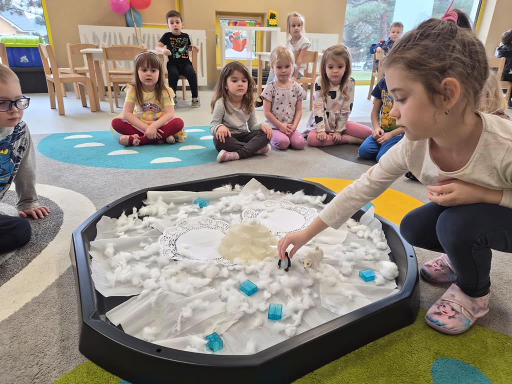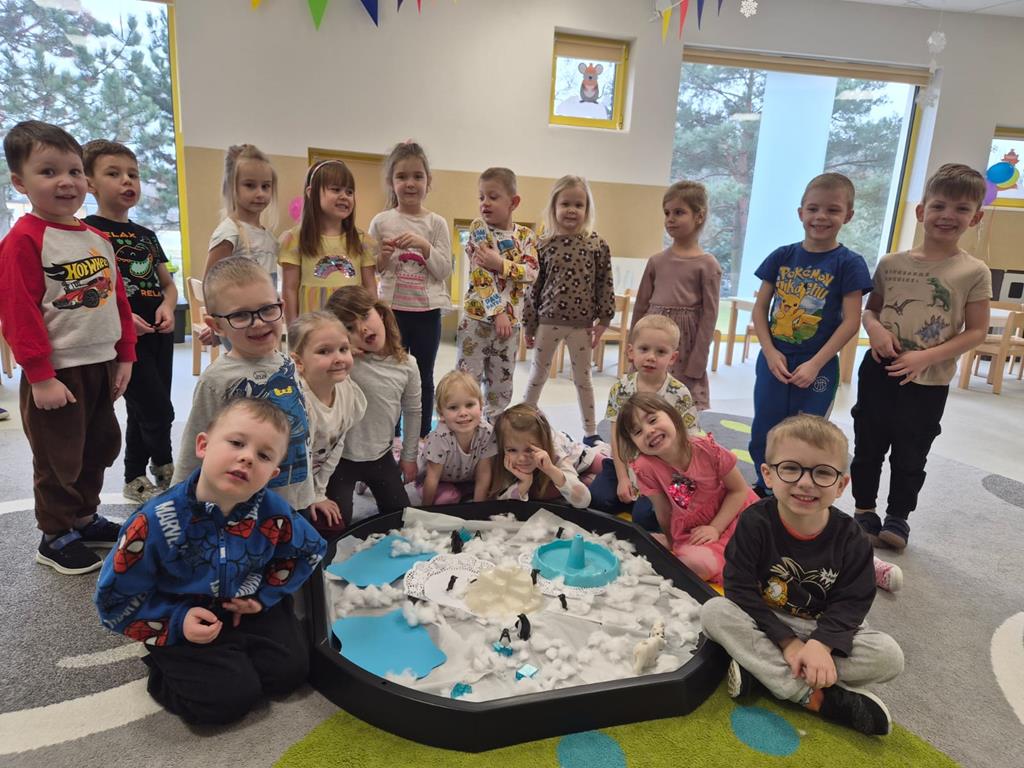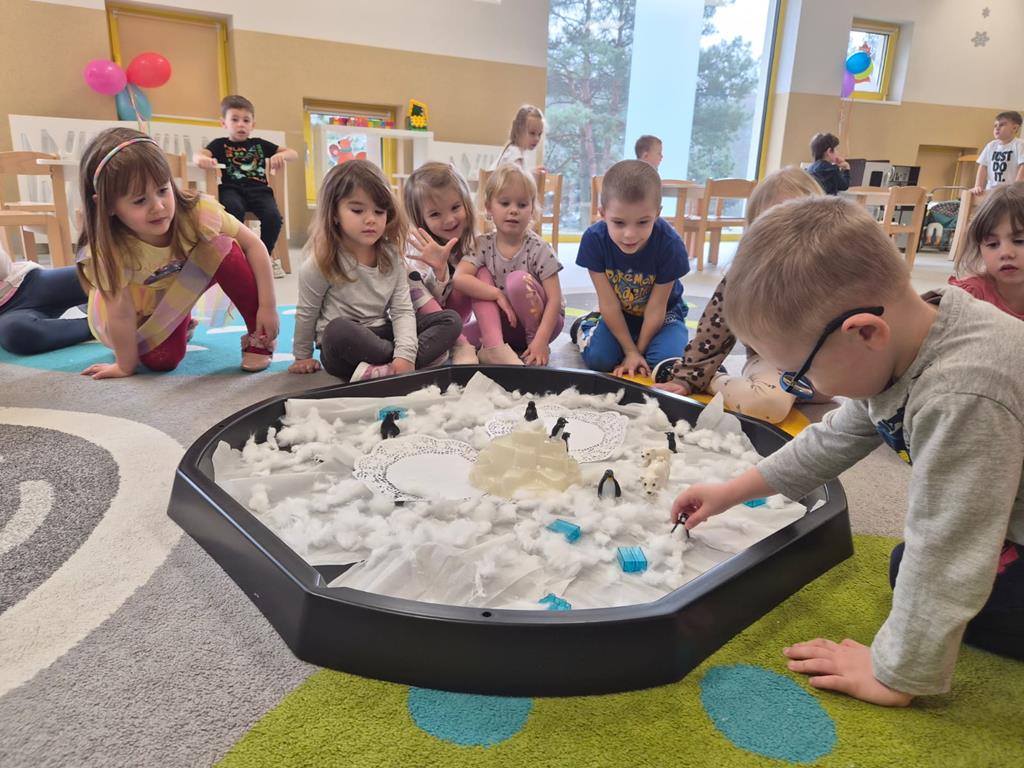 Najwięcej radości sprawiło dzieciom wspólne tworzenie makiety Antarktydy. Z wielkim zaangażowaniem budowały lodową krainę i umieszczały w niej zwierzęta. Była to wspaniała okazja do rozwijania wyobraźni, kreatywności oraz nauki poprzez zabawę.