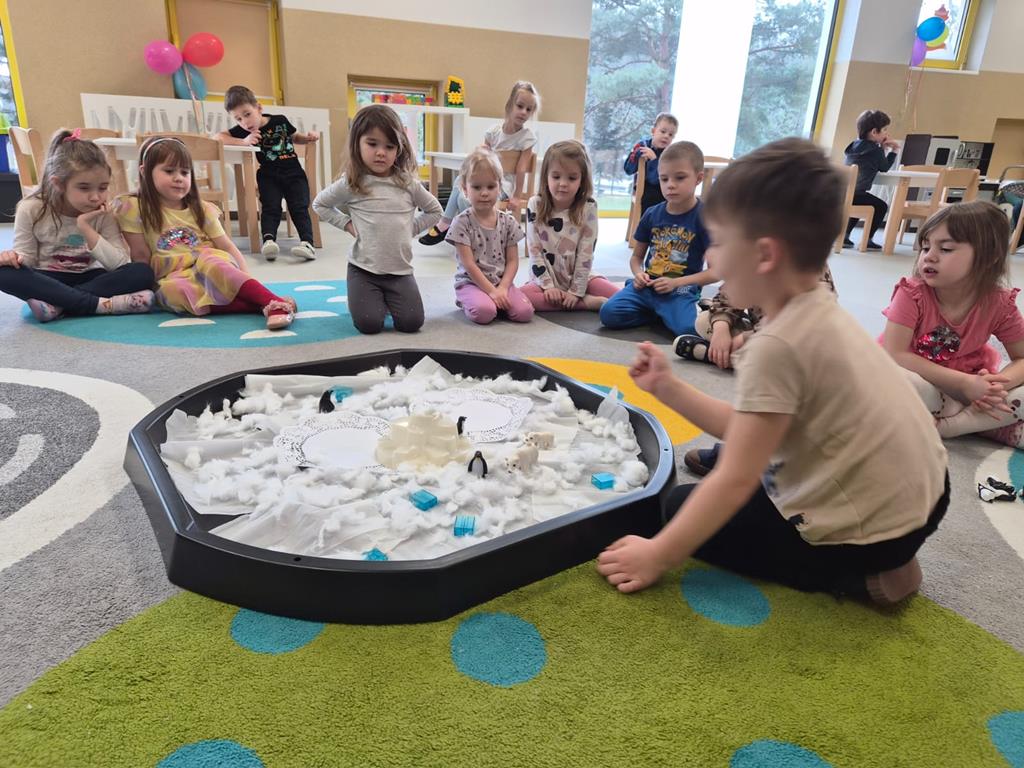 Dzieci z grupy „Liski” wybrały się w niezwykłą podróż na Antarktydę – mroźny kontynent pełen lodu i ciekawych zwierząt. Podczas zajęć przedszkolaki poznały mieszkańców tej zimowej krainy, m.in. pingwiny, foki i misie polarne oraz dowiedziały się, jak wygląda życie w tak zimnym miejscu.