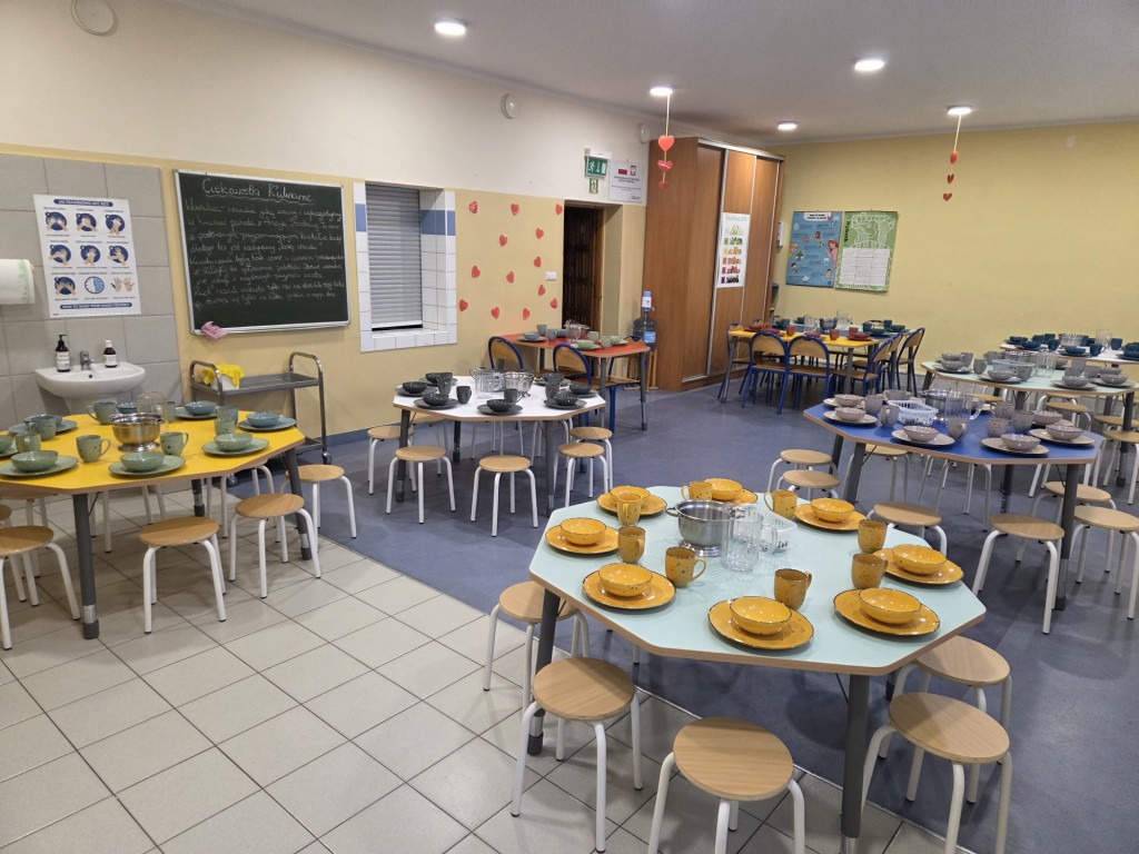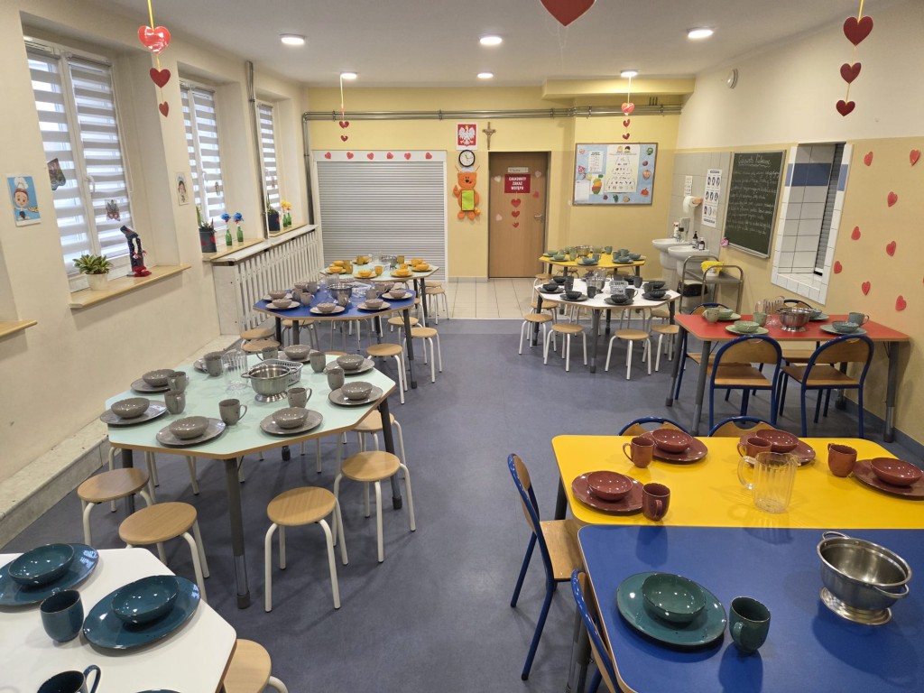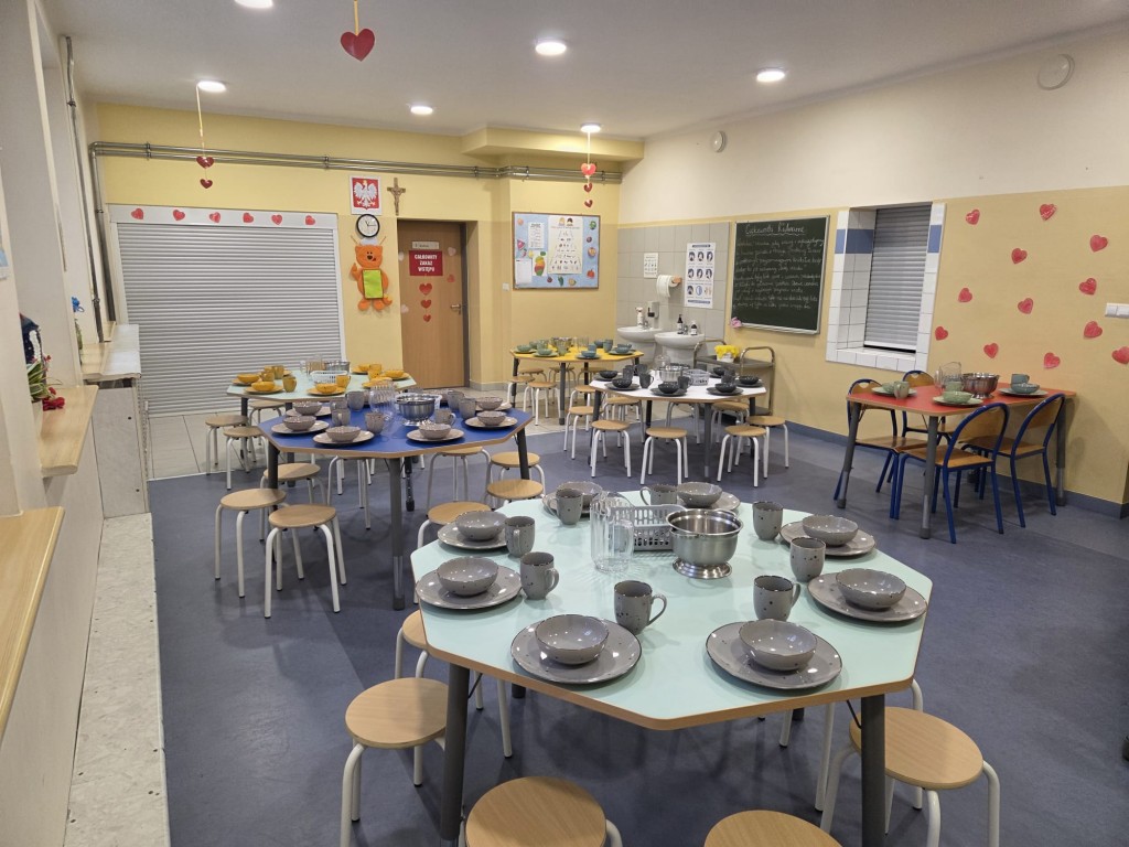 Zupa – krem z białych warzyw. Pierogi z mięsem, duszoną cebulką i boczkiem, ogórek małosolny, woda. Deser mleczny